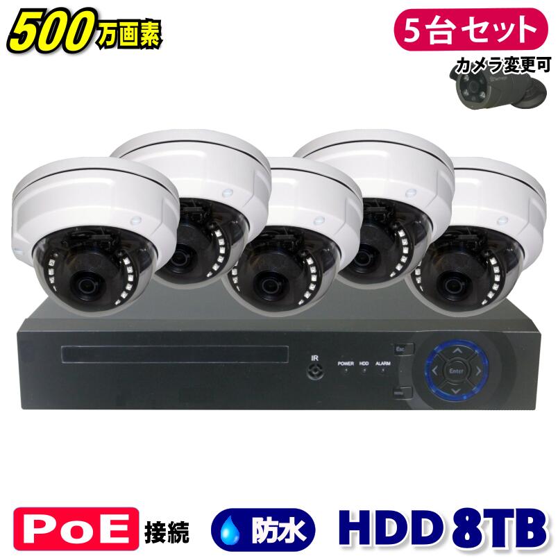 防犯カメラ 500万画素 8CH POEレコーダーSONY製 ドーム型 IPカメラ5台セット (LAN接続)HDD 8TB 高画質 監視カメラ 屋外 屋内 赤外線 夜間撮影 3.6mmレンズ