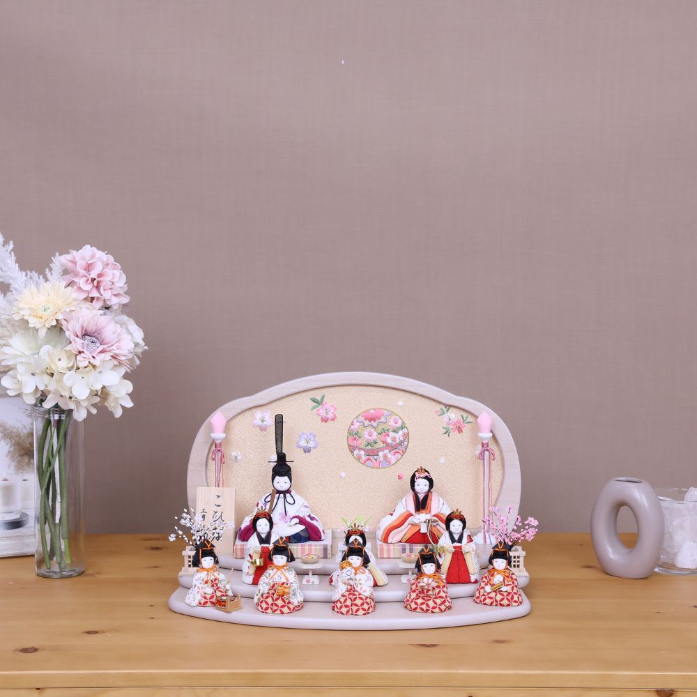 雛人形 ひな人形 コンパクト 横幅40cm 木目込み雛人形 木目込みひな人形こひな くるみ三段飾り 十人飾り 10人 飾り 刺繍屏風 おしゃれ かわいい 小さい 北欧風 人気 黒 ピンク パステルカラー 緑 初節句 お祝い 女の子 桃の節句 ひな祭り