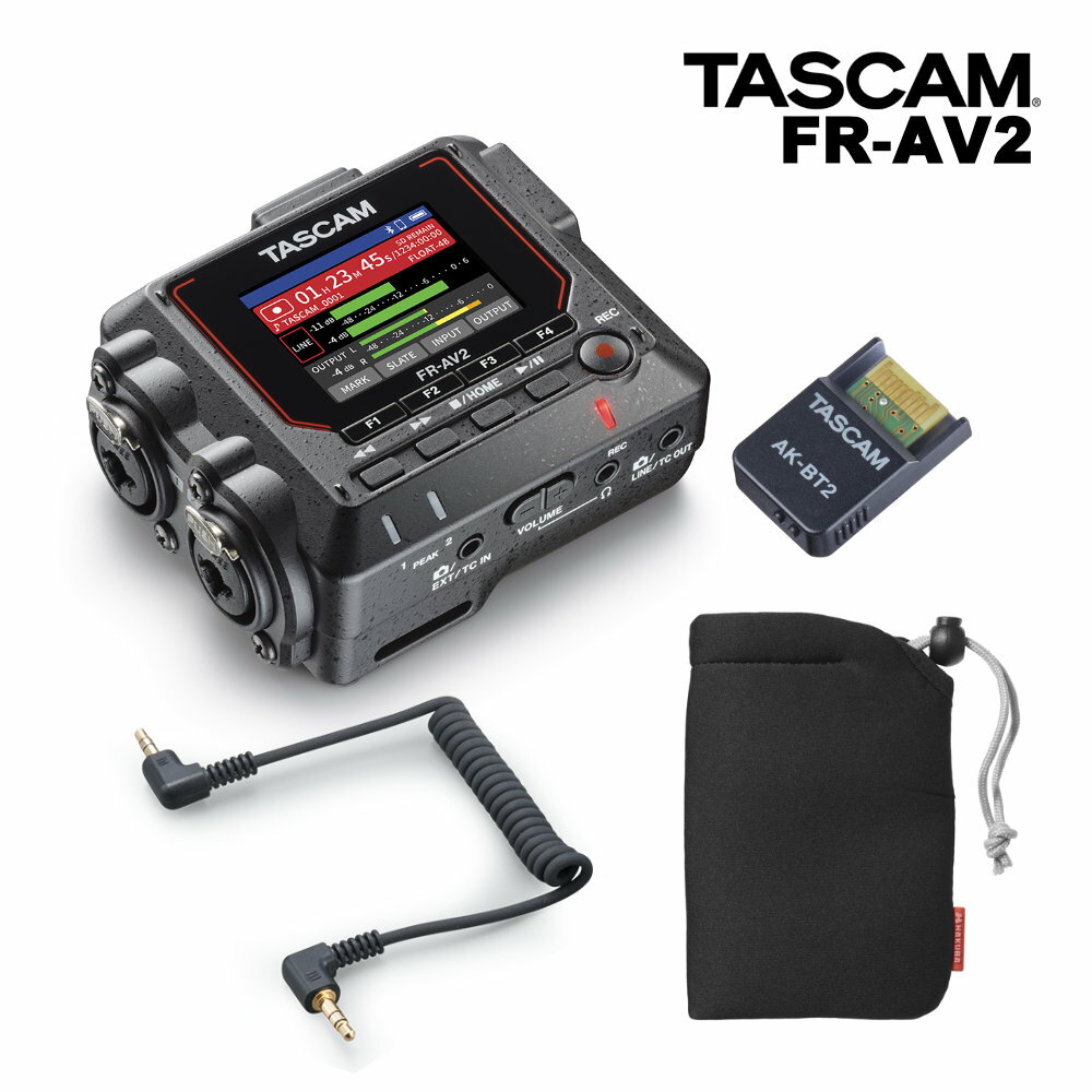 【セット内容】TASCAM フィールドレコーダー FR-AV2/TASCAM Bluetoothアダプター AK-BT2/汎用ケース/ステレオミニケーブル タイムコードジェネレーターを搭載した32ビットフロートフィールドレコーダー スタッフのコメント: 【セットの特長】 ビデオグラファーにお勧めの接続用ケーブル&Bluetoothアダプターのセット。接続ケーブルはビデオカメラや一眼カメラのマイク入力への接続に適した短めのカールコードをお付けします。 【レコーダーの特長】 シューマウントしても取り回しがし易い軽量・小型設計で、かつ録音状態が一目で分かる液晶画面が魅力的なフィールドレコーダー。タイムコードの入力端子も出力端子も付いているので、カメラやレコーダーとの同期も楽々。 【メーカーサイトより】 32ビットフロート対応2chポータブルフィールドレコーダー/タイムコードジェネレーター 主な仕様 レコーダー部仕様 記録メディア/ファイルシステム microSD カード(64 MB ~ 2 GB)、microSDHC カード(4 GB ~ 32 GB)、microSDXC カード(48 GB ~ 512 GB) 録音再生フォーマット WAV (BWF) サンプリングレート 48 / 96 / 192 kHz 量子化ビット深度 24-bit / 32-bit float 最大入力チャンネル数 2 最大録音トラック数 2 アナログオーディオ入力定格 USB オーディオ サンプリングレート:48 / 96 kHz 量子化ビット深度:24-bit / 32-bit float 入力数:2 チャンネル ※本機からの出力 出力数:2 チャンネル ※本機への入力 プラグインパワー:+2.5 V/+5.0 V タイムコード入力/ 出力 TC IN 端子:3.5 mm(1/8”)ステレオミニジャック (tip:Timecode IN、ring:-、sheild:GND) 信号レベル範囲:0.5 ~ 5Vp-p TC OUT LTC 選択時… 端子 3.5 mm(1/8”) ステレオミニジャック (tip:Timecode OUT、ring:-、sheild:GND) 出力インピーダンス 600 Ω 出力レベル 2 Vpp MIC LEVEL選択時… 端子:3.5 mm(1/8”) ステレオミニジャック (tip:Timecode OUT、ring:Rch、sheild:GND) 出力インピーダンス:110 Ω 出力レベル:40 mVpp Bluetooth Bluetooth アダプター(AK-BT1/AK-BT2)専用端子 電源 単3形電池3本(アルカリ乾電池、ニッケル水素電池、リチウム乾電池) パソコンなどからのUSB バスパワー 専用ACアダプター(TASCAM PS-P520U、別売) 消費電力 3.8 W(最大時) 質量 267 g / 195 g (電池を含む / 電池を含まず) 動作温度 0 ~ 40 ℃ 外形寸法 99 x 80.4 x 40.3 mm(幅 x 高さx 奥行き、突起部を含む) 同梱品 FR-AV2 x1 セーフティーガイド(保証書付き) x1 TASCAM ID登録ガイド x1 【対応OS】※レコーダー発売時点 Windows Windows 10 64-bit 2022 Update (Version 22H2) New , Windows 11 2022 Update (Version 22H2) iOS iPadOS 17 , iOS 17 , iOS 16 , iPadOS 16 ご確認ください。 ※製品の仕様及びデザインは改良のため予告なく変更することがあります。また、モニタの設定などにより色調が実物と異なる場合がございます。ご購入後に思った色と違うなどでのご返品はお受けできません。 ※こちらの商品は店頭及び他のショッピングサイトでも販売を致しております。タイミングによっては売り切れの場合がございます。ご注文時に売り切れの場合は、お取り寄せにお時間を頂くこととなります。予めご了承下さい。『FR-AV2』は32ビットフロート録音に対応し、タイムコードジェネレーターを搭載したコンパクトなフィールドレコーダーです。他のタイムコードデバイス無しで、映像収録におけるタイムコード同期システムにシームレスに組み込むことができます。音声をワイヤレスでモニタリングすることが可能なほか、複数台のリモート制御やワイヤレスタイムコード同期にも対応します※。映画やドラマ、報道、結婚式等イベントの映像制作など、幅広い収録用途に対応するビデオグラファーためのオールインワン音声収録ソリューションです。 ※別売のBluetooth®アダプター『AK-BT2』が必要。 デュアルA/Dコンバーター搭載、32ビットフロート録音対応、ゲイン調整不要で音割れのない収録が可能 2系統のXLR/TRSロック付きコンボジャック入力端子(EIN-127dBu、TASCAM Ultra-HDDAマイクプリアンプ搭載)、3.5mmステレオミニ入力を搭載 サンプリング周波数:48k / 96k / 192kHzに対応(USBオーディオ使用時は48k / 96kHz) タイムコードジェネレーター、タイムコード入出力、ジャムシンクでの同期に対応。高精度TCXO搭載 ワイヤレスヘッドホン/イヤホンを使用した音声モニタリングが可能※ 32ビットフロート対応Windows / Mac / iOSデバイス用2イン/2アウトUSBオーディオインターフェース ※別売のBluetooth®アダプター『AK-BT2』が必要。 最大192kHzでの32ビットフロート録音 『FR-AV2』はデュアルA/Dコンバーター搭載で広いダイナミックレンジを確保し、編集時に音量を調整しても解像度を維持できる32ビットフロート録音に対応しています。ゲイン設定は不要で音割れしない録音が可能です。サンプリング周波数最大192kHzの高音質録音に対応しています。 記録メディア/ファイルシステム microSD カード(64 MB ~ 2 GB)、microSDHC カード(4 GB ~ 32 GB)、microSDXC カード(48 GB ~ 512 GB) 録音再生フォーマット WAV (BWF) サンプリングレート 48 / 96 / 192 kHz 量子化ビット深度 24-bit / 32-bit float 最大入力チャンネル数 2 最大録音トラック数 2 アナログオー