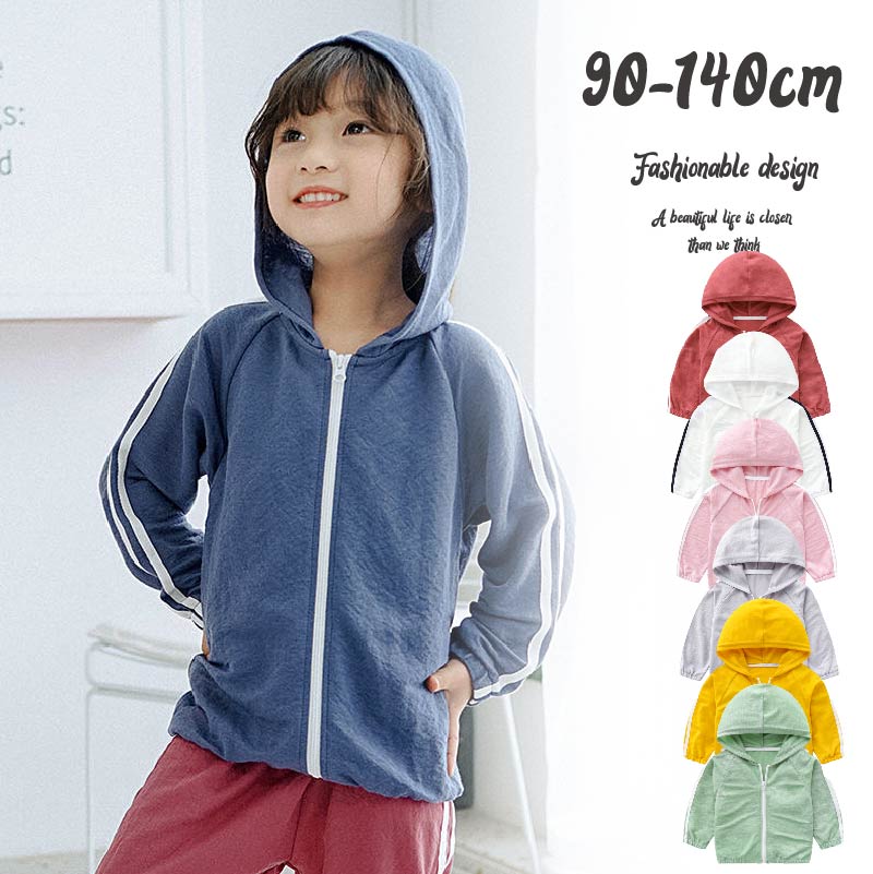 キッズ ユニセックス 長袖 フード付き 日焼け防止 UVカット パーカー / 冷房対策 子供服 子ども服 男の子 女の子 カーディガン ファッション ジュニア カジュアル アウトドア 海水浴 薄手 夏 日焼け止め 90 100 110 120 130 140
